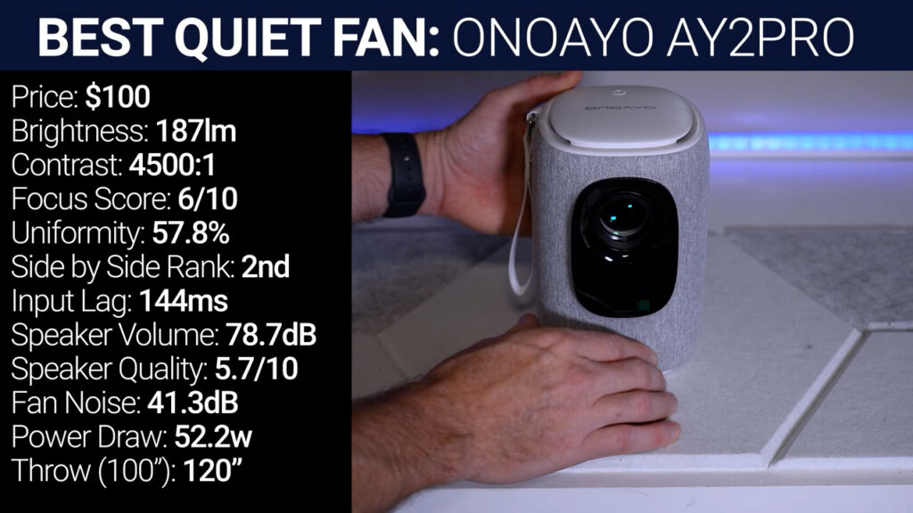 If gaming isn’t as important to you and you want the quietest projector with good picture quality, the ONOAYO finished second overall in the side-by-side testing, had the highest contrast of any of the projectors I measured, and had a quiet fan that I measured at just 41.3 decibels.