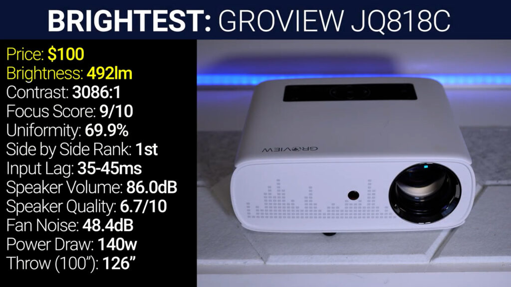 If you want the brightest option under $100, that’s the Groview JQ818C which is over two times brighter than the next brightest projector and consequently finished first in the side-by-side testing. The Groview also had the loudest speakers and acceptable input lag numbers for gaming. But all that brightness comes at a cost, because the fan is louder than most at 48.4 decibels and the Groview is roughly three times as big and uses 3x as much power as the rest of the projectors in the video. Still, almost 500 ANSI lumens for $99 is pretty incredible.