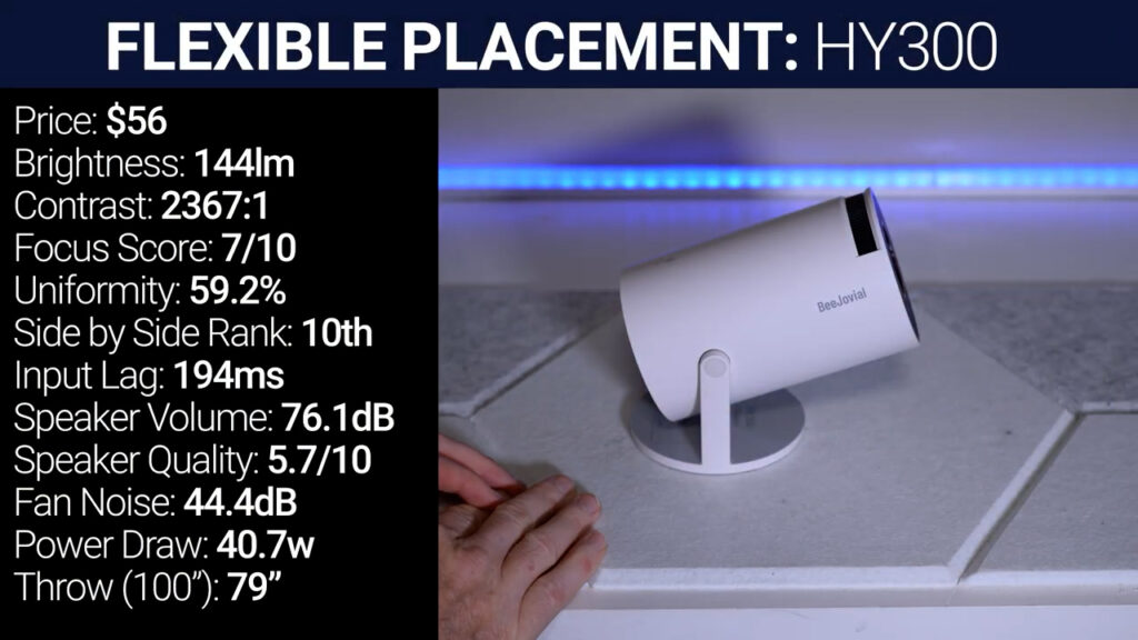 And last, if you want a little flexibility in placement, I also admit to kind of liking the TikTok famous HY300 due almost entirely to its little aiming stand and short throw ratio, and it also has 4 point keystone and a 44.4 decibel fan. But be aware that people have reported issues with the Android operating system freezing, it uses a Netflix app that’s designed for cell phones, and it has almost 200 ms of input lag which means gaming, but it is kind of neat for $50, especially if you’re just watching YouTube.