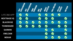 Not all the dash cams have all the functions, but here’s a quick chart showing which cameras offer which functionality, and I’ve also included the Life360 app which offers a lot of feature overlap with the cloud connected dash cams under their gold plan for $14.99 a month.