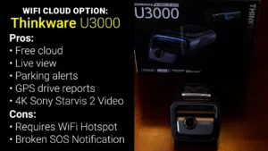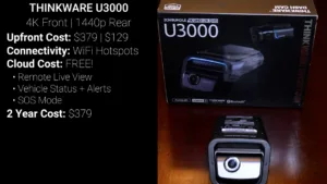 Next is the Thinkware U3000 for $379 which has a 4K Sony Starvis 2 front facing camera, and an optional 1440p rear camera for $129 extra. The Thinkware is unique in this video because it doesn’t have any cellular connection but instead lets you connect it to multiple Wi-Fi hotspots so you can use your car or phone’s cellular connection when driving and then connect to your home Wi-Fi when in range, and the major advantage of that strategy is that ThinkwareConnect, their cloud service, is completely free, so no monthly fee meaning the two year cost of ownership is $379, the same as the purchase price.