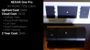 Next is the Nexar One Pro Dual Dash Cam which has a 4K front facing camera and a 720p cabin camera. The Nexar One Pro has an upfront cost of $449 for the 64GB storage version and a monthly subscription of $9.99 which includes LTE service, cloud storage, and live view for a two year cost of ownership of $689.
