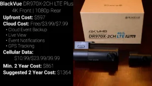After that is the BlackVue DR970X-2CH Plus LTE which as the name implies is a two channel dash cam with a front facing 4K Sony Starvis 2 image sensor and a rear facing 1080p camera. The BlackVue has an upfront cost of $597 and lots of options for monthly plans. Unlike the other LTE cameras in this video BlackVue has separate plans for their cellular service and cloud, and activating their SIM card will cost $10.99 a month for 1GB of data, 23.99 for 3GB, or $39.99 for 5GB. On top of the cellular plan you’ll also need the BlackVue cloud, and they offer a free plan with almost all their features except for GPS tracking, but you’ll need to pay $7.99 a month for the full feature set, which gives the BlackVue a minimum two year cost of ownership of $861 for the 1GB LTE plan and free cloud, and an eye watering $1364.52 for the midlevel 3GB data plan and smart cloud plan.