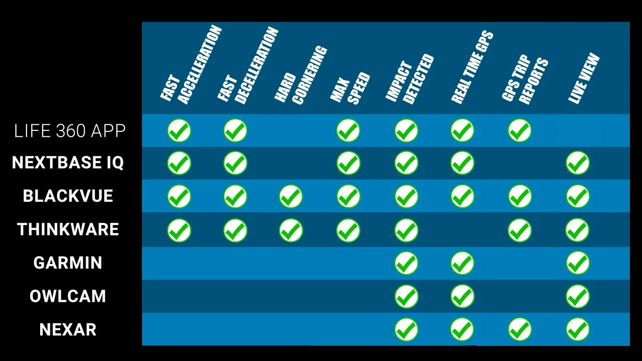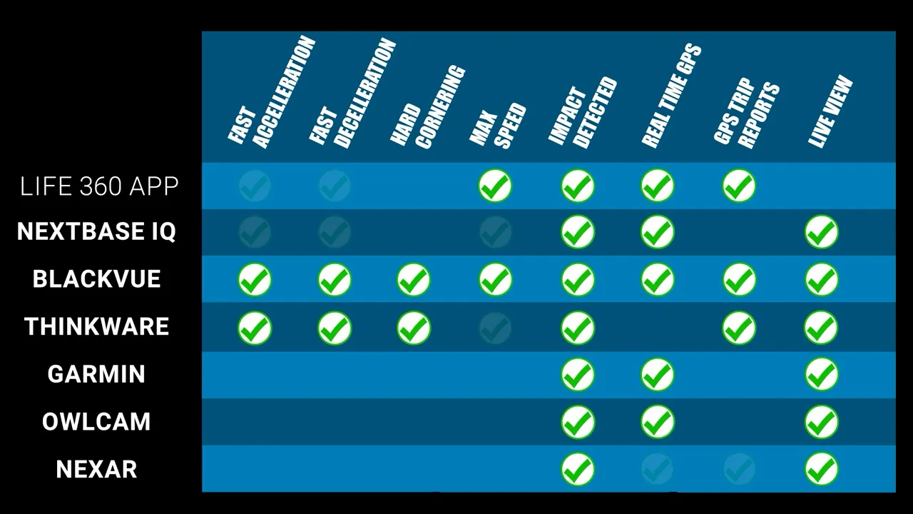 Not all the dash cams have all the functions, but here’s a quick chart showing which cameras offer which functionality, and I’ve also included the Life360 app which offers a lot of feature overlap with the cloud connected dash cams under their gold plan for $14.99 a month.