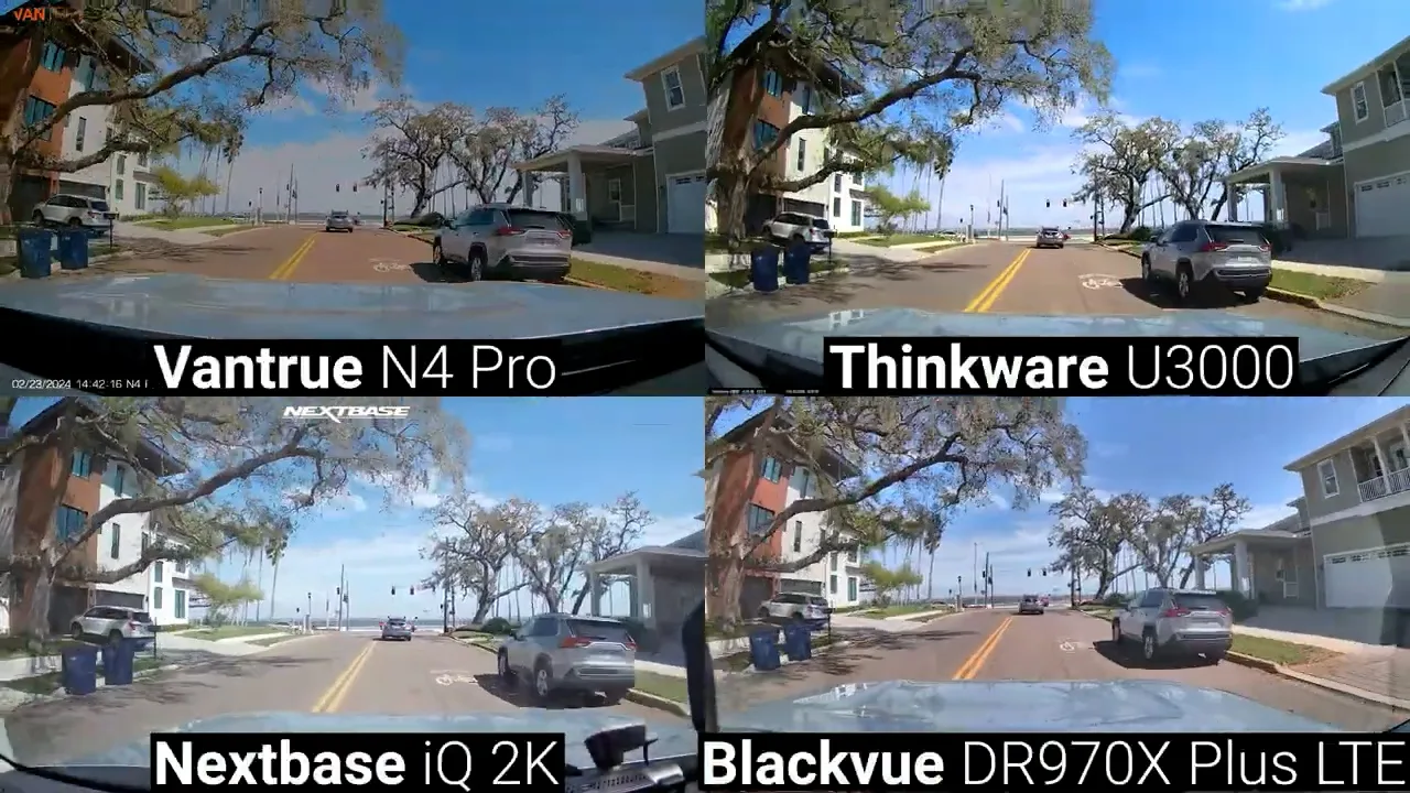 Looking at night testing the HDR difference becomes even more noticeable with the Vantrue catching license plates and car details that are basically just a blur on the other cameras, and to my eye the BlackVue easily takes second place since both the Thinkware and Nextbase were a bit overexposed at night completely losing detail in bright areas like license plates, and taillights.