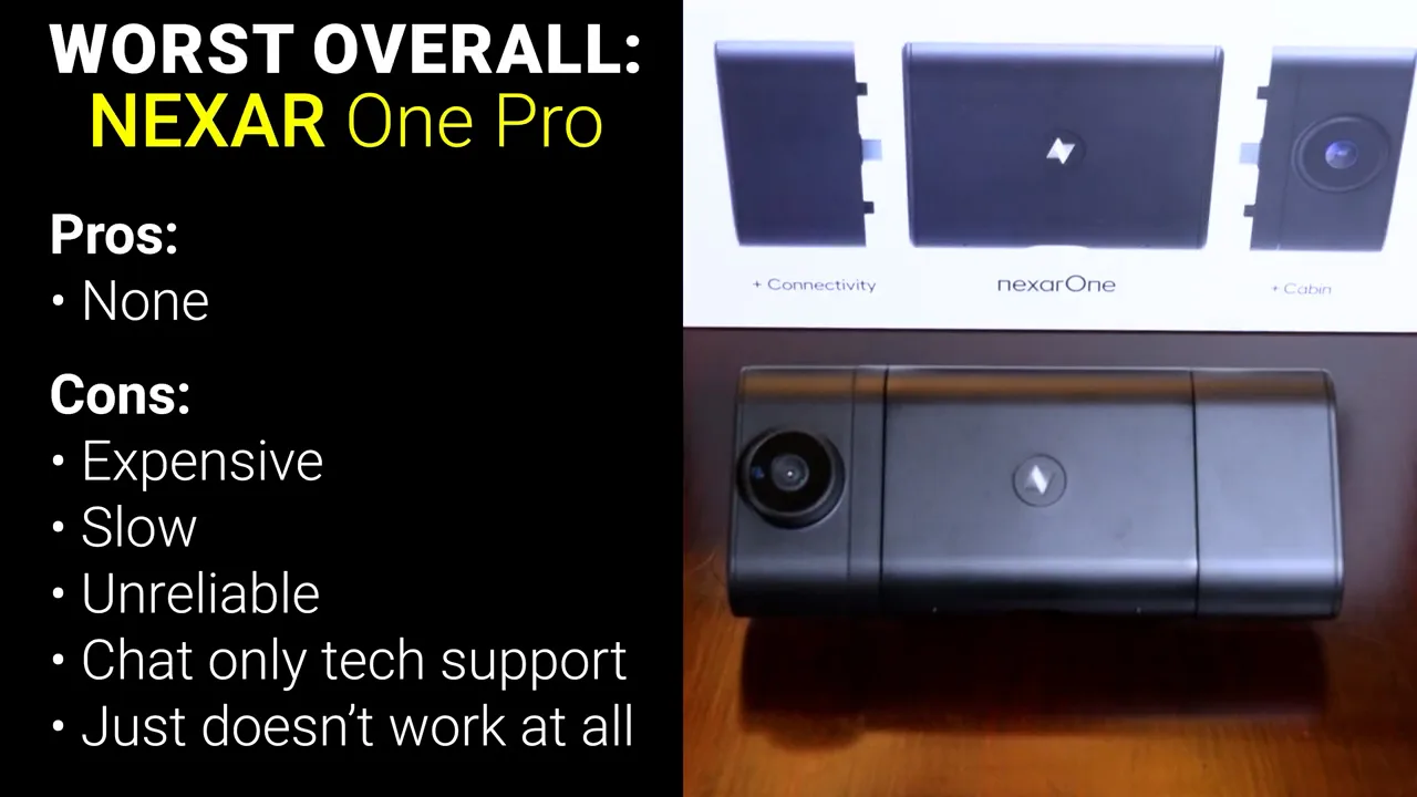 With all their special features tested, the last thing we need to look at is how well these things function as normal dash cams, but for time and sanity’s sake I’m going to eliminate a few that I don’t think are even worth considering, starting obviously with the Nexar One Pro, which is easily the worst product I’ve ever tested on my channel. It was actually so bad that I figured I must have gotten a faulty unit, so I ordered another one, and the replacement was just as bad if not worse, and I honestly think Nexar should be ashamed for keeping these on the market and you definitely shouldn’t buy it.