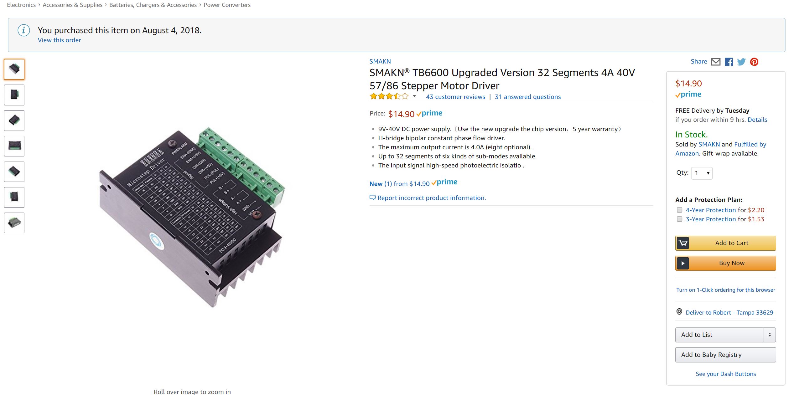 Since a stepper motor needs to have a relatively large current pulsed rapidly, you’ll also need a stepper motor driver to handle the heavy lifting. I really like the quality of the products from stepper online so I asked them to send me one of their drivers. Unfortunately, I didn’t do enough research before requesting the driver from them, and the one I got wasn’t compatible with the 3.3V logic that the ESP8266 outputs. I went ahead and bought the same driver that I used for my first two shades, it works flawlessly and it’s one of the cheapest ones on amazon.