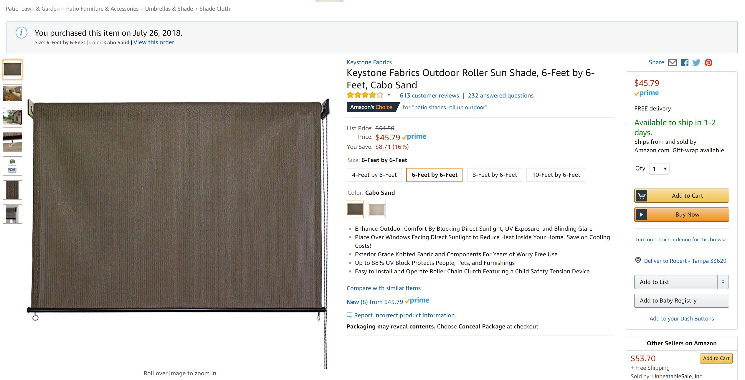 I used this shade from amazon.com, it’s available in 4 by 6, 6 by 6, 8 by 6, and 10 by 6. I specifically used the 6 by 6 version, but my setup would work fine for the 4 by 6 and the 8 by 6 also. The 10 by 6 version might be a bit much for a single motor to handle, so I’d steer clear of that.