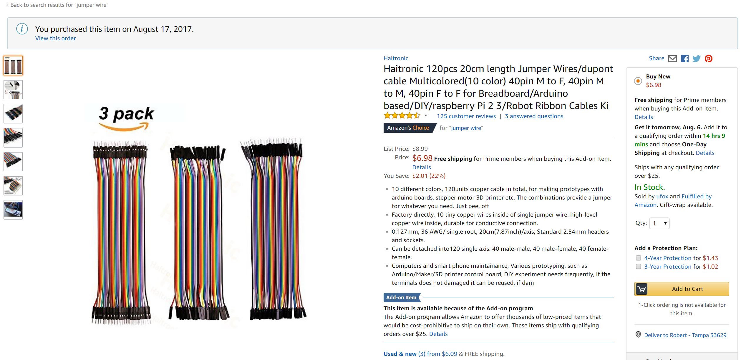 Those are the main parts that I needed to buy, but lets quickly talk about everything that I already had around from previous projects that I used in this project: You’ll need wire, I used cat6 cable because I had it around. it has 4 twisted pairs, and I used one twisted pair for each of the 4 wires on the stepper motor. If I was going to buy wire specifically for this problem I’d get one of these 250ft spools of four core 18 gauge wire, for $30, it’s an absolute steal, that’s like 12 cents a foot.