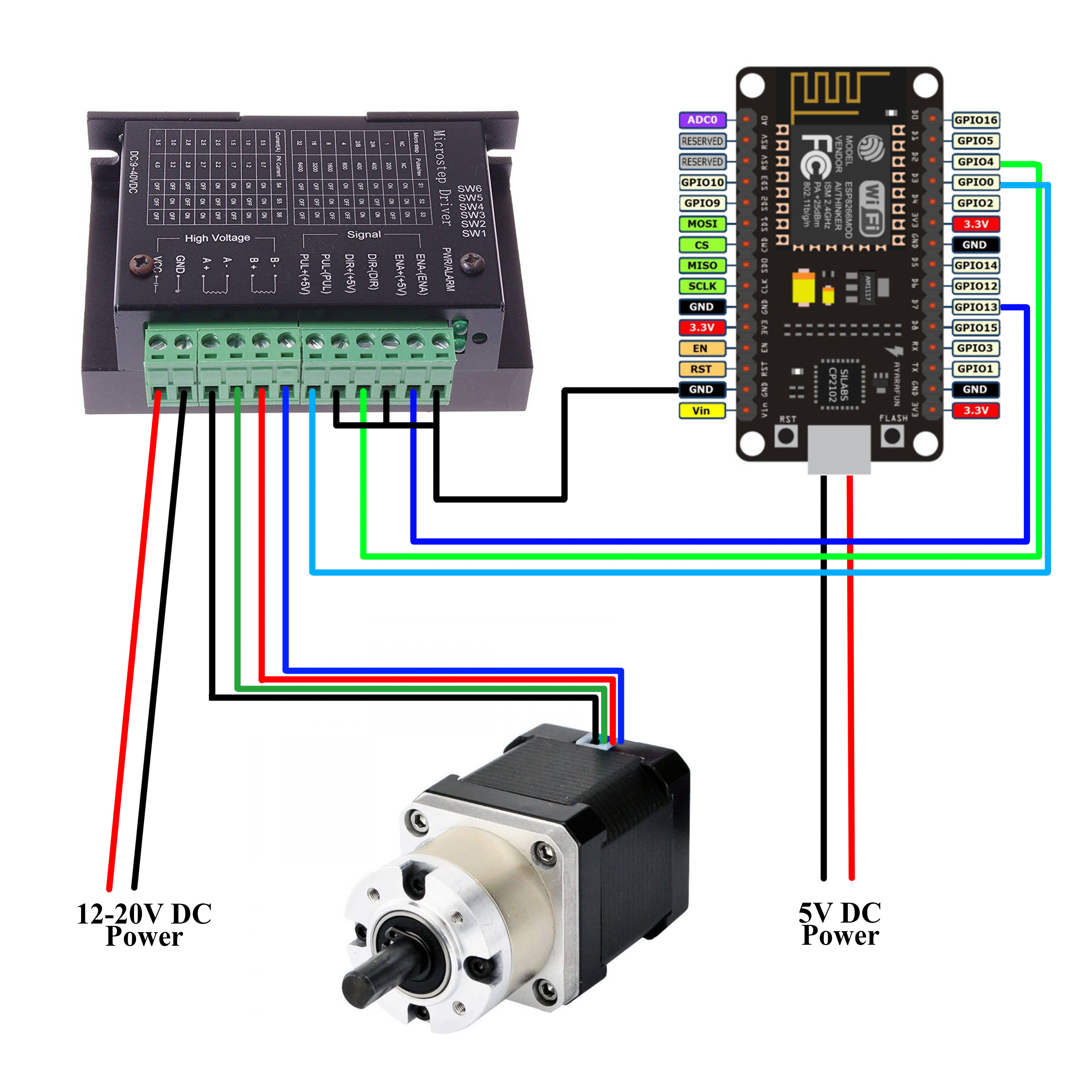 This driver has 3 pins that need to be connected to your microcontroller: The DIR positive input on the driver connects to GPIO4, which is marked as D2 on the node-mcu, The PUL positive input on the driver connects to GPIO 0 marked as D3 on the node-mcu, and the ENA positive input connects to GPIO13 which is D7. You’ll also need to connect each of the negative inputs to your board. I connected them with a single wire to my nodeMCU and then just bridged the connections together with small pieces of wire.