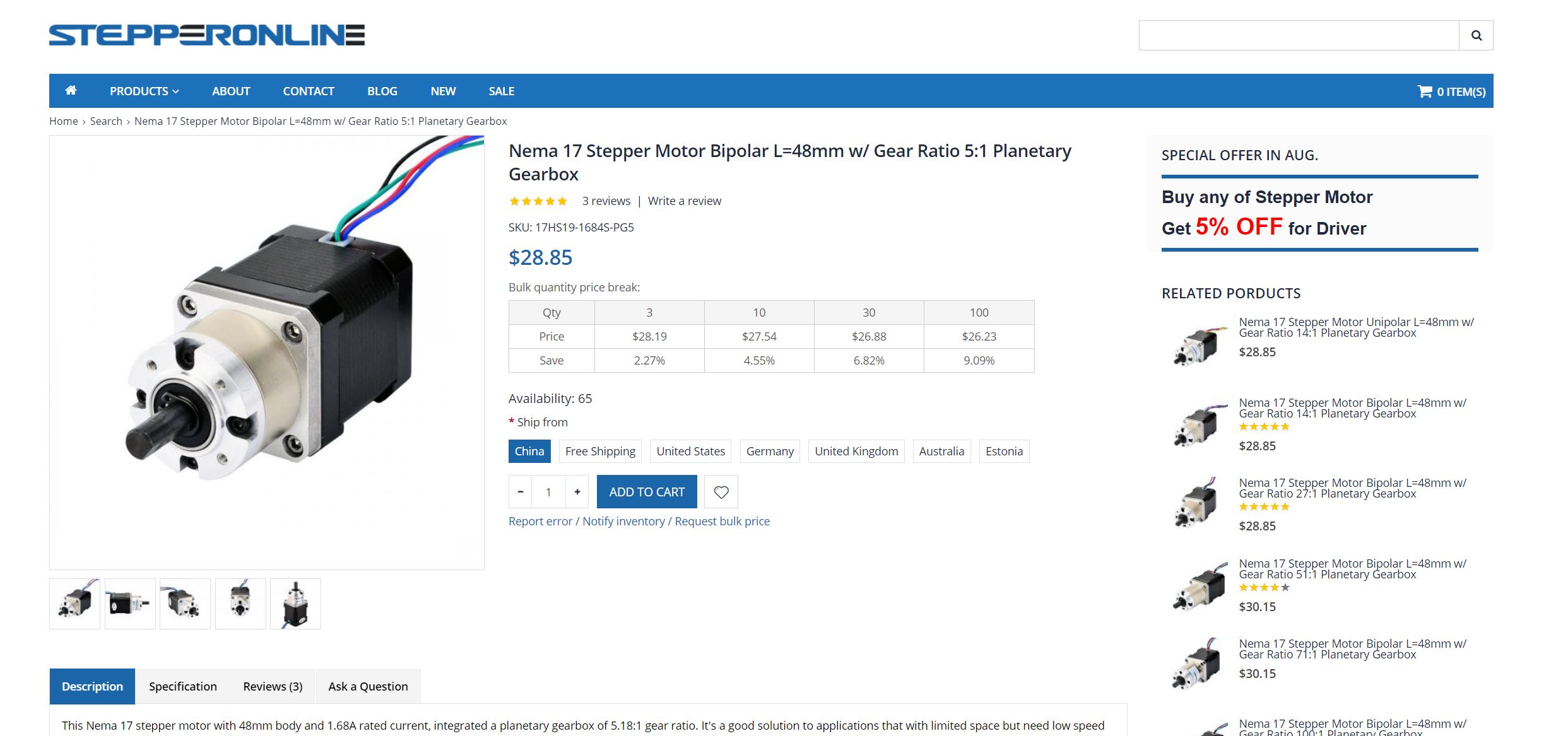 Next we need a motor to move these things. I opted for a planetary geared stepper motor with a 5:1 gear ratio. Stepper online makes super high quality stepper motors for relatively cheap. When I made my original project I purchased them on amazon for around $45 each, but they were nice enough to send me one to make this video, so thanks stepper online.