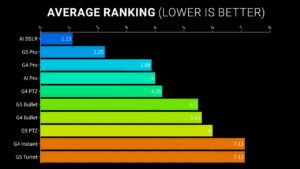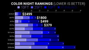So, for color night vision, the top performer at every distance was the AI DSLR and while the G4 PTZ, AI Pro, and G5 Pro rounded out the top four, the AI DSLR was the only one I’d seriously consider using in color night vision mode.