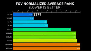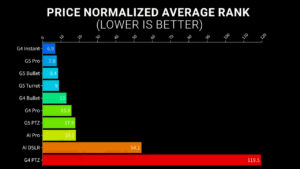 And last, taking cost into consideration, I multiplied the adjusted ranking by the cameras price and divided by 100, which made the $99 G4 instant the highest value outdoor exposed camera, followed by the $379 G5 Pro, the $129 G5 Bullet, and $129 G5 Turret.