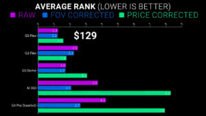 To try to normalize the numbers I divided the picture quality ranking by the camera’s horizontal field of view and multiplied by 100, making the G5 Pro the best camera when adjusted for field of view, with the AI DSLR in second, the G4 Pro in third, and the AI Pro in fourth.