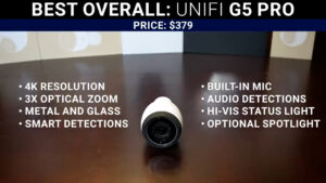 So that means that out of the 19 cameras that UniFi sells, the top performer if you’re building a premium system is definitely the $379 G5 Pro, which has 4K resolution, 3x optical zoom, great build quality, and smart person, vehicle and animal detections. It’s also got a good microphone for recording audio and doing audio based smart detections, it’s got a highly visible status light for deterrence, and it’s got that option to buy the add-on vision enhancer spotlight for color night vision.
