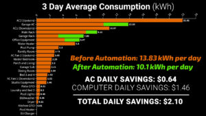 Overall, as of writing this script, I was able to drop my daily power usage from an average of 99.27 to 77.94 kWh per day, which is 21.33 kWh or $3.65 of savings a day, and that comes out to about $1331 a year, making this a pretty worthwhile experiment.
