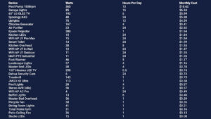However, my second not-so-typical expense is that I have a massively overbuilt network, security camera setup, NAS, and three fairly powerful desktop computers, one each for my wife and me, who both work from home, and one for my golf simulator. I put a smart plug on each of those three areas, called the main rack, office equipment, and garage rack, and those three spaces together used an average of 22.67kW per day, or about $3.87, which comes out to $116 a month for computers and networking equipment which seems excessive.