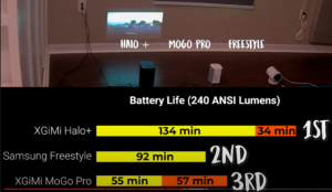 After just 55 minutes the MoGo Pro automatically reduced its brightness to eco mode to conserve battery and then lasted an additional 57 minutes. The Samsung Freestyle ran at its full brightness for one hour and 32 minutes before depleting the entire battery bank and powering off, while the Halo+ was able to maintain playback at 240 ANSI lumens for 2 hours and 14 minutes before automatically switching to eco mode for an additional 34 minutes making it the clear winner in the battery life category followed by Freestyle and then the MoGo Pro.