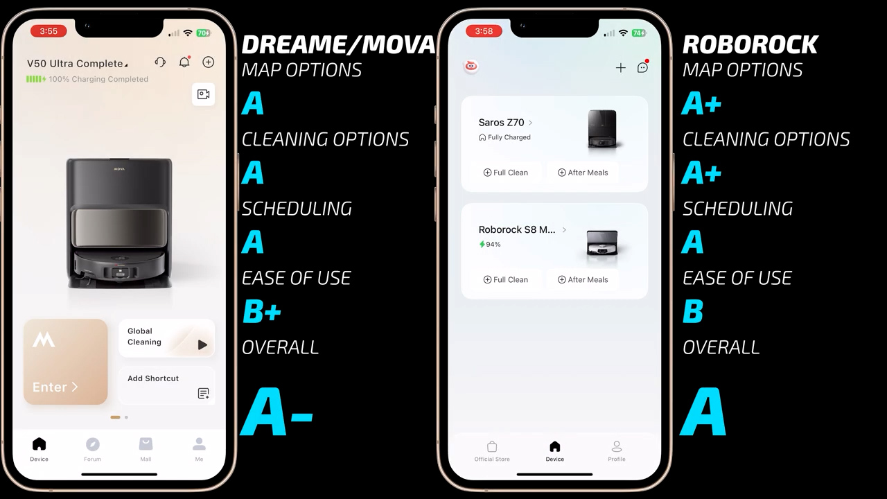 The MOVA V50 Ultra Complete finished in first with an average score of 2.9, thanks to its object avoidance and threshold crossing abilities, but at $1399, that’s $200 more than the Dreame X50 Ultra which has the same threshold crossing, the same object avoidance, and the same mopping but better overall vacuuming scores.
