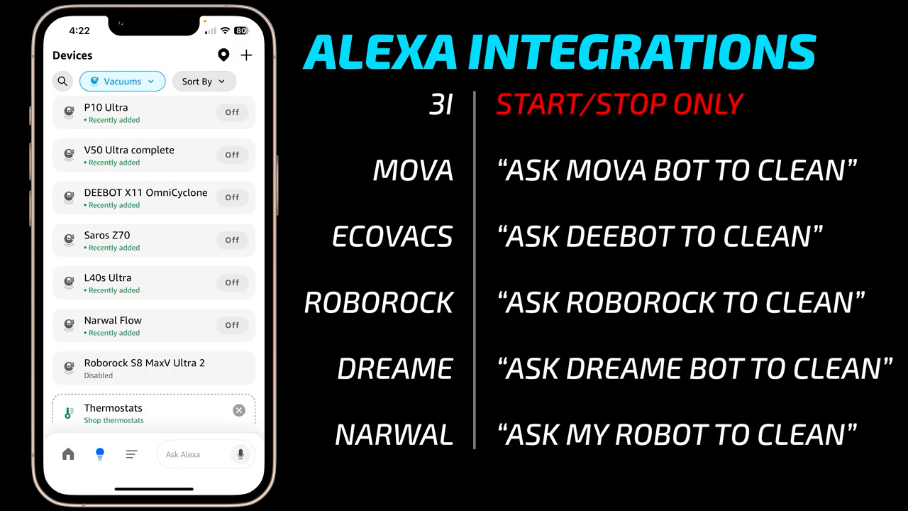 I also tested Google Home integrations and the only one I wasn’t able to get working at all was the Narwal. The Roborock, Dreame, MOVA and ECOVACS all support room specific cleaning commands while 3i only supports on and off.