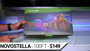 For a price of $150 the least expensive permanent LED kit we’ll be looking at is the Novostella 80 LED, 100 ft, RGB IC lights.  The Novostella kit comes with two 50-foot strings with 40 1.5-inch LED pucks containing 7 RGB LEDs each, spaced 13 inches apart.  Each 50-foot string connects to the single power supply and controller. Novostella says the strings cannot be cut or extended, and in my testing, there was no issue cutting the strings short, but extending the strings past 50 feet or 40 LEDs does not work, and only the first 40 LEDs will light up.