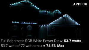 The Appeck’s waterproof power supply is 24 V and 3 A for a total of 72 watts of potential power delivery.  I found that on full brightness white the 72 Appeck lights drew 53.7 watts, which is under 75% of the power supply’s maximum rating, which should lead to a long lifespan.