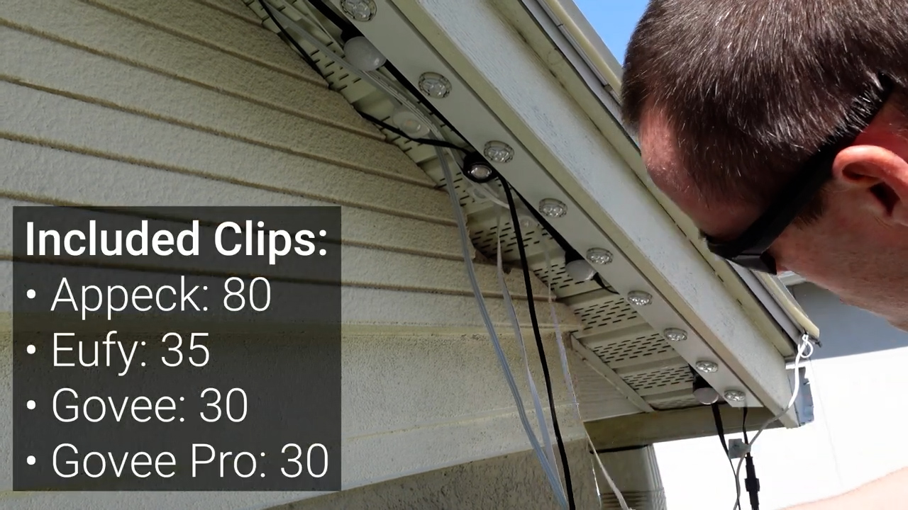 The good news is that the double-sided adhesive does make it easy to put the lights up initially, and then you can come back with the clips and screws after all the lights are positioned. It’s worth mentioning that although the adhesive looked identical on the Govee, Eufy, and Appeck kits, the design of the Appeck lights made it difficult to get enough contact between the tape and soffit, and for my installation I had to use hot glue to get the Appeck lights to stick for anything more than a few minutes.  Still, I think any of these four kits could easily be installed on a first-floor roof using a ladder because the double-sided tape gives you enough time to place the lights and install the clips without having the rest of the string dangling around you.