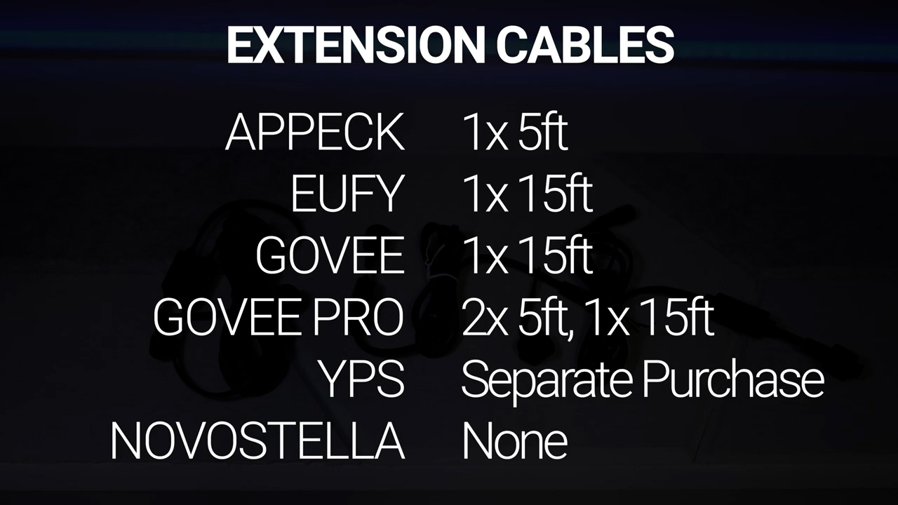 And for large gaps at the end of a string you can use the included extension cables if you’re lucky enough to have a gap at the end of the string, but realistically you’re probably going to need to cut and extend at least one of your strings and I found that the YPS, Novostella, and Govee Pro lights could all be cut and extended up to 25 feet without any issues, but the Eufy, Govee non-pro, and Appeck kits started to have data problems after 10 feet of extension.