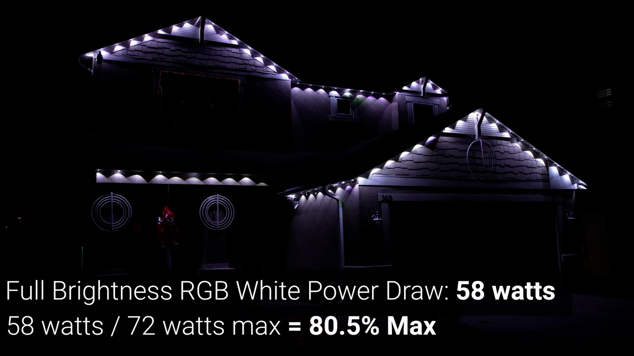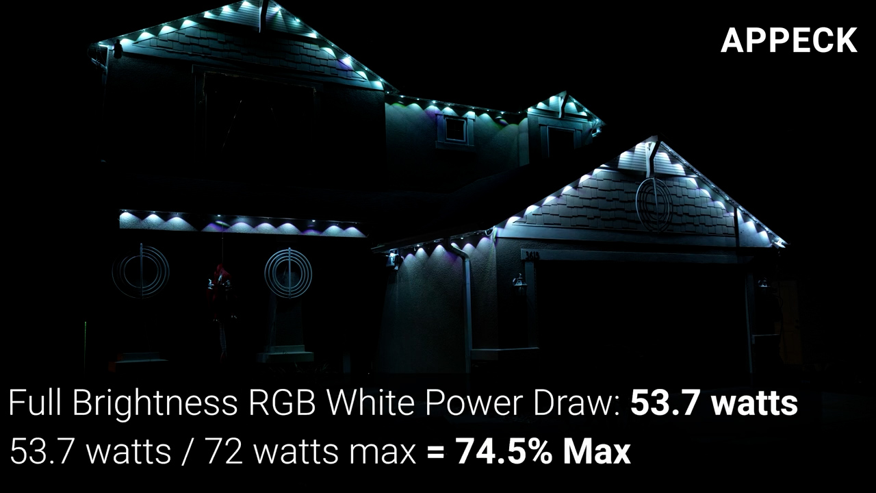 The Appeck’s waterproof power supply is 24 V and 3 A for a total of 72 watts of potential power delivery.  I found that on full brightness white the 72 Appeck lights drew 53.7 watts, which is under 75% of the power supply’s maximum rating, which should lead to a long lifespan.