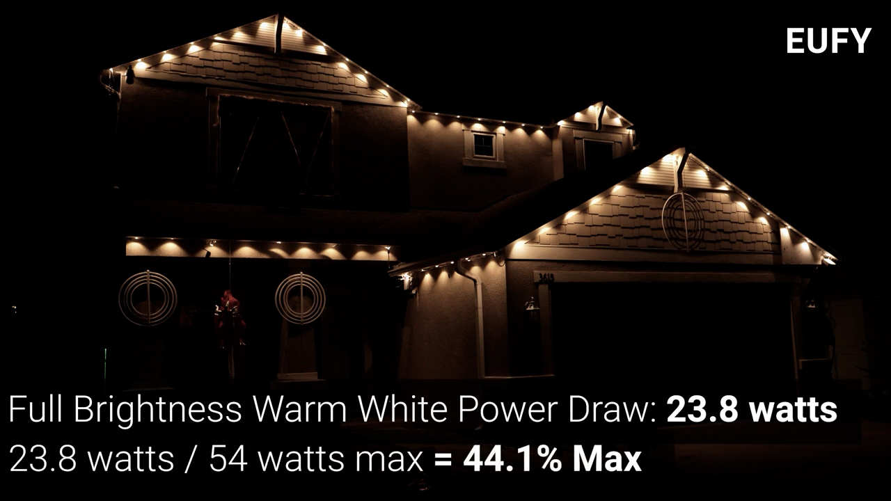 The Eufy power supply and controller are not waterproof, so you’ll need to mount them inside or in a waterproof outdoor box.  The power supply is rated at 36 V and 1.5 A for a total of 54 watts of potential power delivery.  On full brightness white using the RGB chip I measured 55.4 watts of power draw, which is a very concerning 102% of the power supplies rated power, but it’s unlikely that you’d ever use full RGB white since the Eufy LEDs also include a warm white chip, which at 100% brightness only drew 23.8 watts or around 44% of the power supplies rating.