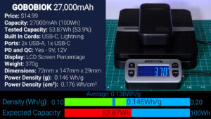 Unfortunately, in my testing the Gobobiok had just 53.87 Wh when discharged at 5 V, so it should actually be advertised as 15,000 mAh, not 27,000 mAh. That makes sense because it only weighs 370 grams giving it a fairly normal power density of 0.146 watt hours per gram.
