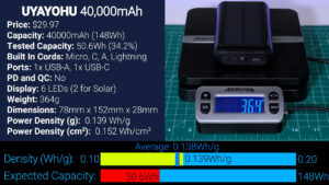 Following that impressive battery is something significantly less impressive. The $29.97 UYAYOHU has all four USB cord types as well as a flashlight and solar panel for charging. That all sounds cool, but the UYAYOHU which claims to be 40,000 mAh, only output 50.6 Wh at 5 V which is 34.2% of expected meaning its real capacity is around 14,000 mAh, which again makes sense based on its weight and despite its low measured capacity it still had a pretty normal power density of 0.139 Wh per gram.