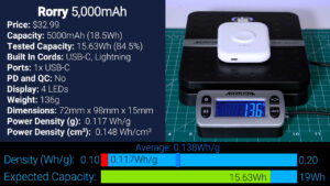 After that for $32.99 is this 5000 mAh battery bank from Rorry which they advertise as a keychain form factor, but it’s pretty big for that. In addition to USB-C and Lightning cords, the Rorry has an Apple Watch charger but doesn’t seem to support wireless phone charging or MagSafe. In my testing, the Rorry output 15.63 Wh at 5 V, which is 84.5% of its expected capacity and had a power density of 0.117 Wh per gram which is well below average.