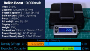 Last, the most expensive battery bank in this category by a significant margin is the $48.99 10,000 mAh Belkin Boost Charge which has Lightning and USB-C cables built-in. The Belkin supports quick charge and power delivery, and, in my testing, it output 31.12 Wh at 5 V, which is 84.1% of its expected capacity, but the Belkin weighed more than most giving it a power density of just 0.130 Wh per gram which is at the low end of the spectrum.
