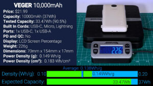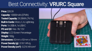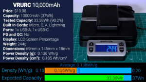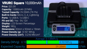 Then for $20.39 we’ve got another VRURC with a different square form factor, and this one has all the same ports and cords as before but with the addition of Quick Charge and USB Power Delivery. Unfortunately, this square version only output 29.28 Wh at 5 V, which is just 79.1% of what we would expect from an advertised 10,000 mAh battery, however, it was 60 g lighter than the other VRURC giving it a much higher power density of 0.161 Wh per gram.