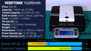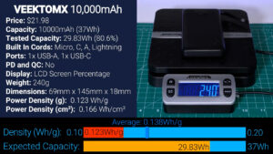 After that for $21.98 is this 10,000 mAh battery from VEEKTOMX, which is the brand that stole the show in last year’s video. This VEEKTOMX looks 100% identical to the rectangular VRURC on the outside with every cord and port type, but unfortunately performed significantly worse, outputting just 29.83 Wh, which is 80.6% of advertised, and it also had the lowest power density yet at 0.123 Wh per gram.