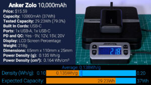 Next up is the $15.59 Anker Zolo which only has a single USB-C built-in cable that loops instead of storing away completely. At 5 V the Zolo output just 29.23 Wh which is only 79% of the 37 Wh we would expect based on its 10,000 mAh rating, and that also gave it a lower power density than the Gobobiok at 0.135 Wh per gram.