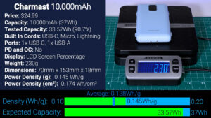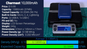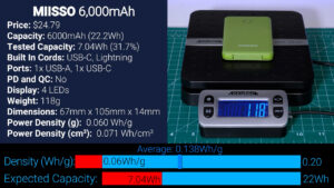 Then for $24.79 is this 6000 mAh bank from Miisso with built-in USB-C and Lightning cords, and at 6000 mAh we should expect 22.2 Wh of capacity but the Misso output just 7.04 Wh, or 31.7% of its already lower advertised capacity which means it’s actually more like a 2000 mAh battery. It had by far the lowest power density yet at 0.060 Wh per gram, which is really bad, especially for the price.