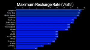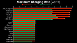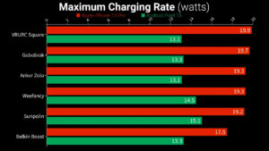 But the Sunpolin, Anker Zolo, VRURC Square, Gobobiok, Belkin Boost Charge, and WeeFancy also support Quick Charge and PD which lets them boost their voltage from 5 V to 9 V to supply extra power, and when charging my Pixel all of them except the Belkin supplied over 19 W, while the iPhone maximum charging rate was lower just based on limitations put in place by Apple to extend battery health.