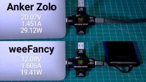 In addition to phone charging, I also tested whether the six PD capable power banks could charge my MacBook, and I was surprised to see that both the Anker Zolo and WeeFancy could not only provide power, but also charge the MacBook, with the Anker outputting 30 W at 20 V and the WeeFancy outputting 20 W at 12 V.