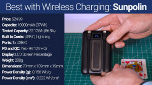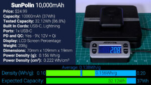 Following that is the $24.99 Sunpolin which has built-in USB-C and Lightning cords, a USB-C port, and in addition to supporting quick charge and power delivery it also has MagSafe wireless charging, a recessed dimple for Apple Watch charging, and a flip out metal kickstand. In my testing, the Sunpolin output 32.12 Wh at 5 V which is 86.8% of advertised and despite all the extra tech in there for wireless charging and quick charging, the Sunpolin still had an impressive power density of 0.156 Wh per gram and a 30% smaller footprint than the other rectangular 10,000 mAh batteries, giving it the second highest power density in watt hours per cubic centimeter.