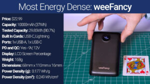 The WeeFancy is another all-around great pick with a nice slim form factor giving it the highest power density both by volume and weight and it has USB-A and C ports, built-in Lightning and USB-C cables, and I was especially impressed by the power delivery implementation that not only had good charging speeds for my Google Pixel and iPhone 13 Pro, but could also charge my MacBook using 12 V Power Delivery. So, if you’re looking for the most power in the smallest package, the WeeFancy is right for you.