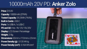 And last, the Anker Zolo was pretty underwhelming in the sense that it had below average capacity, below average power density, and only a single built-in USB-C cable that just loops around and doesn’t really store away, but it was the only bank that supports 20 V PD. So, if that’s what you need it’s kind of your only option, and the good news is that it’s also pretty inexpensive.