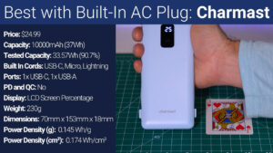 Then the most expensive of the identical trio is this $24.99 battery from Charmast which also has the Lightning and combination USB-C and USB-Micro cords that pull down opposite the AC plug. But the Charmast seems to have slightly upgraded internals allowing it to charge about 1 W faster, as well as provide significantly more power via passthrough charging my Google Pixel at 7.2 W in addition to the 16 W used to charge the internal battery. The Charmast also had the highest percentage of its advertised capacity, outputting 33.57 Wh, which is 90.7% of advertised, but it weighed slightly more than the VEGER giving it a lower power density of 0.145 Wh per gram.