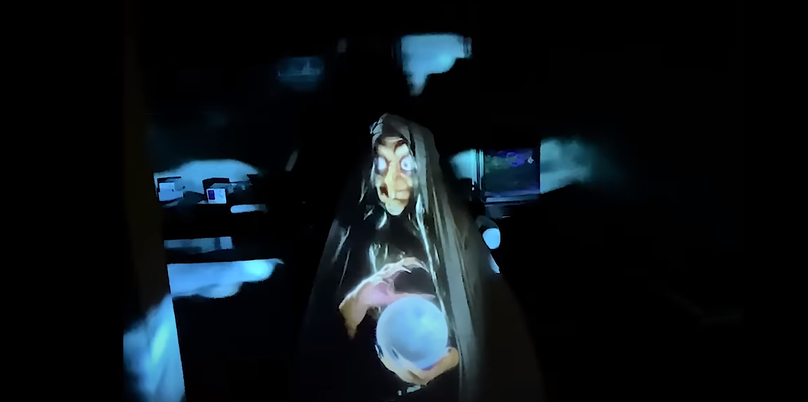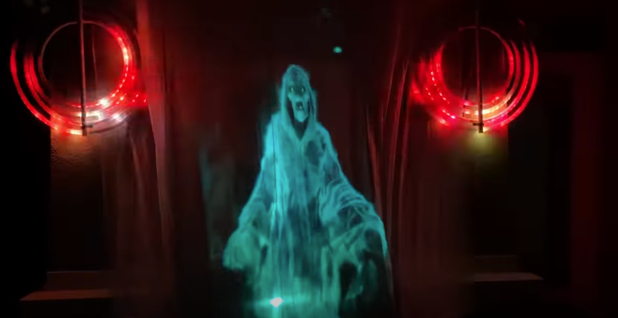 The next projection effect is what AtmosFX calls hollusions, because they aren’t quite holograms which are 3 dimensional, instead these are floating projections using transparent fabric. The amount of transparency will directly effect how bright the hollusion is because the more transparent the material, the more light will pass through it without forming an image. This is important for a two reasons: First, if you have a dim projector it might be hard to see the image at all, and second, if there’s a wall or solid any solid object in front of your hollusion the light is going to pass through and create an image on that wall.