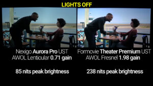 Just like lenticular screens, for the last few years all Fresnel screens have been designed to work only with ultra-short throw projectors, but I do have one new Fresnel Screen material from Valerion that is designed to work with standard throw projectors. You can see that its ambient light performance isn’t as impressive as the ultra-short throw versions, only rejecting about 50% of ambient light from above the seating area compared to the more than 90% light rejection on the UST Fresnel screens.