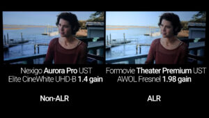 If you’re looking for an ALR material, the Formovie Fresnel screen is the best at reducing laser speckle to a moderately low amount while maintaining extremely high brightness and rejecting between 91% and 95% of ambient light depending on the source, and in all my testing and having personally used the Formovie Fresnel for the last two years it basically only has two weaknesses. First, it’s only offered in 100” fixed frame, which I know is a huge dealbreaker for some spaces, and second, in certain very bright scenes you can notice the circular Fresnel structure in the top corners of the screen. It’s never been enough to bother me, but it’s something to be aware of.