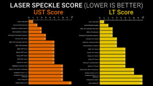 I evaluated each screen material for laser speckle using the Valerion Pro 2 and Hisense PX3-Pro and found that by far the screen material that eliminates laser speckle the most is the woven acoustically transparent white screen from Silver Ticket, followed by the white spandex portable screen from Aurzen, and then the Cinewhite UHD-B screen from AKIA slash Elite Screens and the AKIA MaxWhite 2 Screen. After looking at the screen materials under a microscope it seems that the screens with the most surface texture were the best at eliminating speckle, and the screens that included reflective coatings like Black Diamond, Cinegray 5D, and the High Gain Vividstorm Fusion Lenticular screen also had significantly more laser speckle than screens without reflective coatings.
