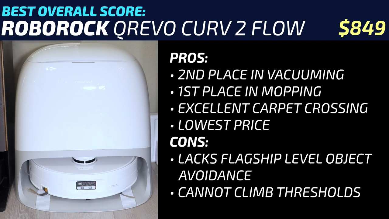 Roborock QREVO Curv 2 FlowMSRP:$999.99Common Price:$849.99Link:The Roborock QREVO Curv 2 Flow that had the 2nd highest carpet vacuuming score and the best mopping performance ended up in first place. The roller mop cover was 100% effective at keeping carpets dry, making it an excellent option for homes with mixed hard flooring and high pile carpets and it’s a great pick and an excellent value considering it’s priced much lower than the rest of the vacuums in this video. But you should be aware that it’s missing common flagship features like advanced object avoidance, high threshold crossing, and it’s much taller than the Roborock Saros 20, eufy S2, and Dreame X60 Max Ultra Complete, so it’s not as good for cleaning under low furniture.