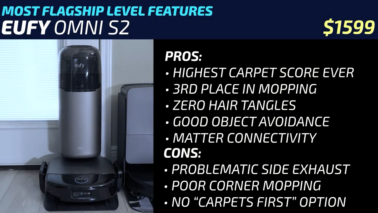 eufy Omni S2MSRP:$1599.99Common Price:$1349.99To me, the eufy OMNI S2 seems like the most flagship level vacuum in this video, recording the highest carpet vacuuming score of any vacuum I’ve ever tested with well above average mopping performance, great hair tangle avoidance, good object avoidance, and Matter connectivity. Its two biggest shortcomings are the fact that it has a side exit exhaust that pushes light debris out of the way and that its corner mopping algorithm makes it look like the OMNI S2 has no idea what its own dimensions are. But both of those issues are fixed with better path planning that can happen via firmware updates. While they’re at it, eufy should also add an option to vacuum all the carpets first before getting the mop wet since it lacks a roller mop cover like the less expensive Roborock QREVO Curv 2 Flow.
